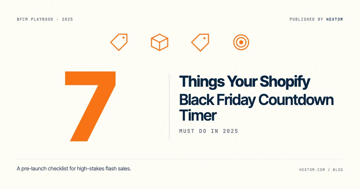 Black Friday and Cyber Monday are the highest-stakes flash-sale events on the Shopify calendar — and the countdown timer on your storefront is one of the few pieces of UI that has to behave perfectly across the full 5-day window. A timer that flips on 20 minutes late, runs in the wrong time zone, or competes with the cart page can cost more than the app subscription several times over. This guide is a 7-point checklist of what your Shopify BFCM countdown timer must do, with sample copy and common-mistake callouts for each, and a five-app comparison table at the end.