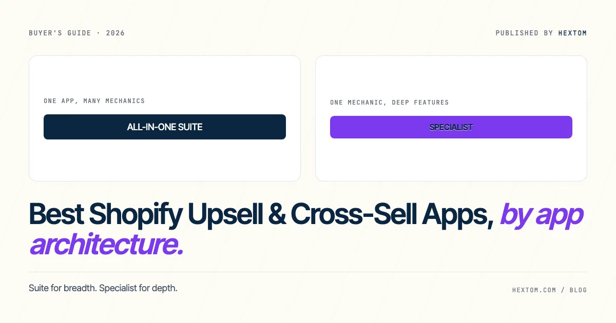 The right Shopify upsell or cross-sell app depends less on rating or install count and more on app architecture — whether you want one suite covering many upsell mechanics, or a specialist app that goes deep on one. Get the architecture wrong and you’ll either pay for a stack of single-mechanic apps that don’t talk to each other, or buy a suite where every individual feature is “good enough” rather than best-in-class. This guide segments the eight Shopify upsell and cross-sell tools merchants ask about most often by architecture, recommends a primary pick and an alternative for each segment, and includes a comparison table and FAQ aimed at the questions merchants actually ask.